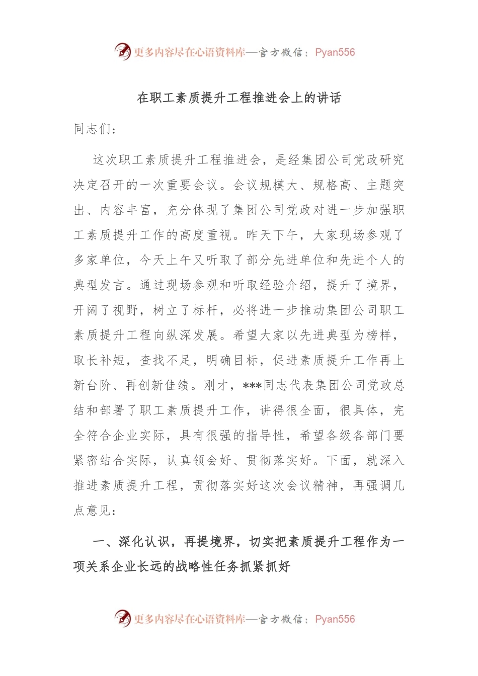 在职工素质提升工程推进会上的讲话同志们:这次职工素质提升工程推进会,是经集团公司党政研究决定召开的一次重要会议。会议规模大、规格高、主题突出、内容丰富,充分体现了集团公司党政对进一步加强职工素质提升工作的高度重视。昨天下午,大家现场参观了多家单位,今天上午又听取了部分先进单位和先进个人的典型发言。通过现场参观和听取经验介绍,提升了境界,开阔了视野,树立了标杆,必将进一步推动集团公司职工素质提升工程向纵深发展。希望大家以先进典型为榜样,取长补短,查找不足,明确目标,促进素质提升工作再上新台阶、再创新佳绩。刚才,***同志代表集团公司党政总结和部署了职工素质提升工作,讲得很全面,很具体,完全符合企业实际,具有很强的指导性,希望各级各部门要紧密结合实际,认真领会好...