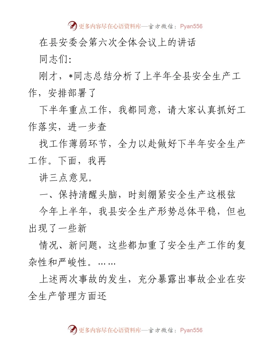 [发言] 县安委会第六次全体会议 - 强化安全生产意识,落实责任与隐患排查.docxVIP免费原创优质