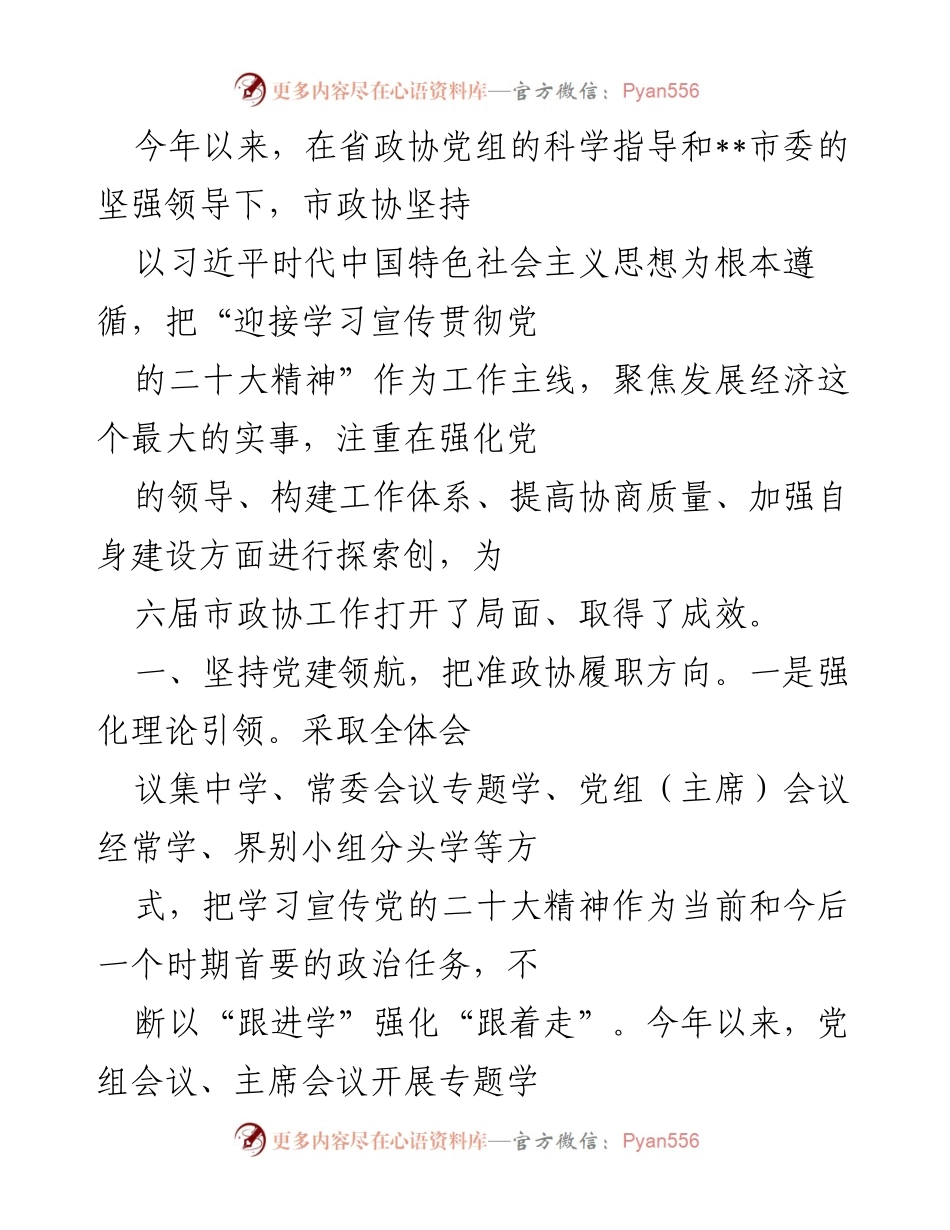 今年以来,在省政协党组的科学指导和**市委的坚强领导下,市政协坚持以习近平时代中国特色社会主义思想为根本遵循,把“迎接学习宣传贯彻党的二十大精神”作为工作主线,聚焦发展经济这个最大的实事,注重在强化党的领导、构建工作体系、提高协商质量、加强自身建设方面进行探索创,为六届市政协工作打开了局面、取得了成效。一、坚持党建领航,把准政协履职方向。一是强化理论引领。采取全体会议集中学、常委会议专题学、党组(主席)会议经常学、界别小组分头学等方式,把学习宣传党的二十大精神作为当前和今后一个时期首要的政治任务,不断以“跟进学”强化“跟着走”。今年以来,党组会议、主席会议开展专题学习**次,组织界别学习活动**次,培训市县政协委员***余人次。主动承接省政协习近平总书记关于加强和...